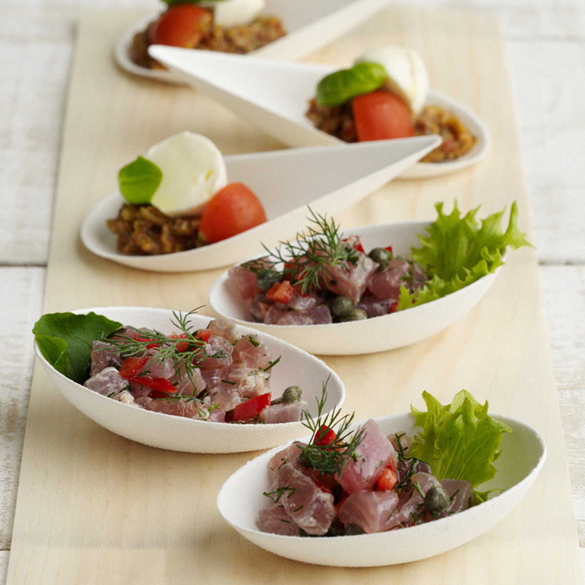 These delightful small single use canape dishes are made from renewable sugar cane fibre - bagasse. Use them for small bites that require a vessel. Food can be eaten directly from the dish.